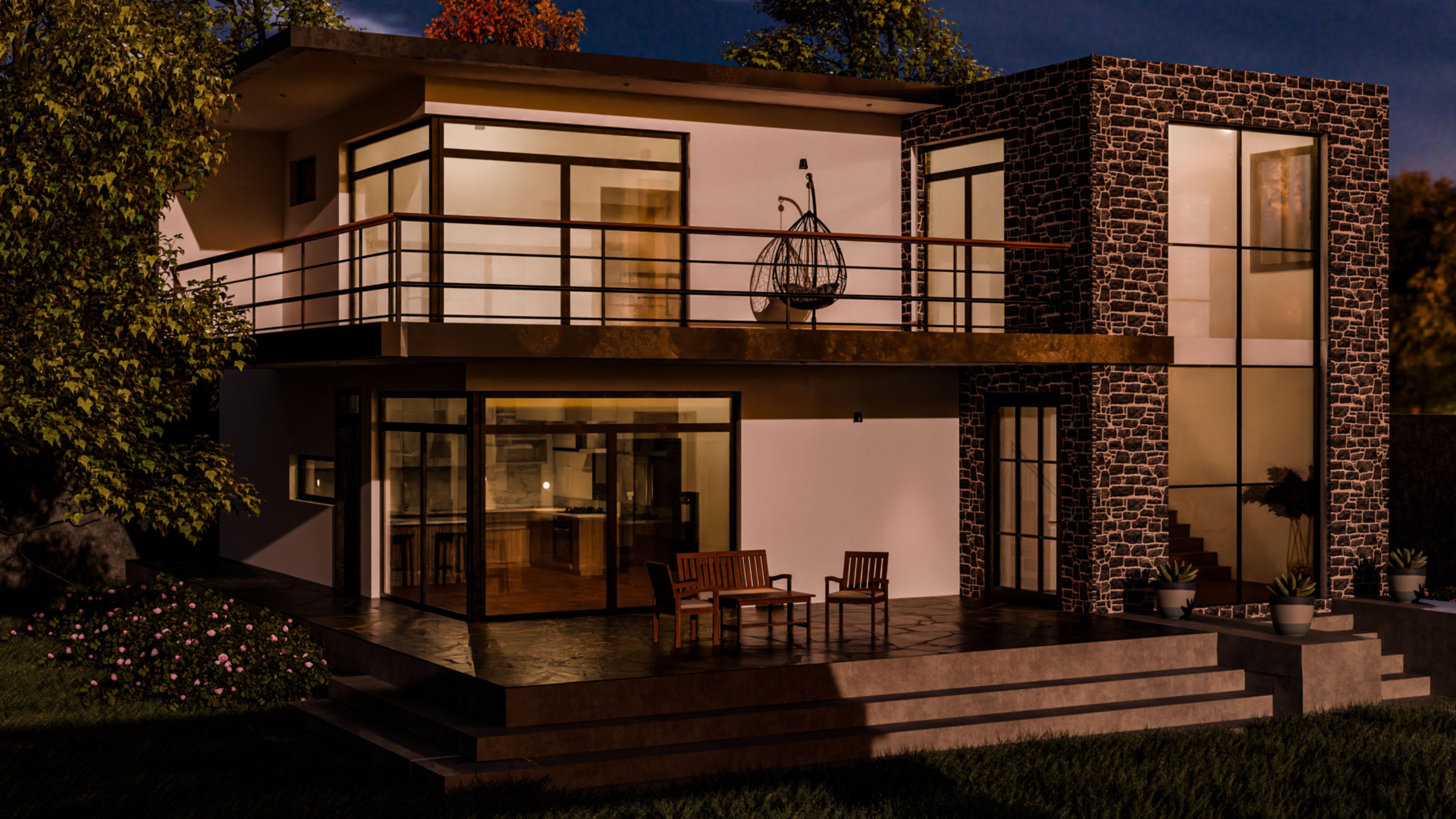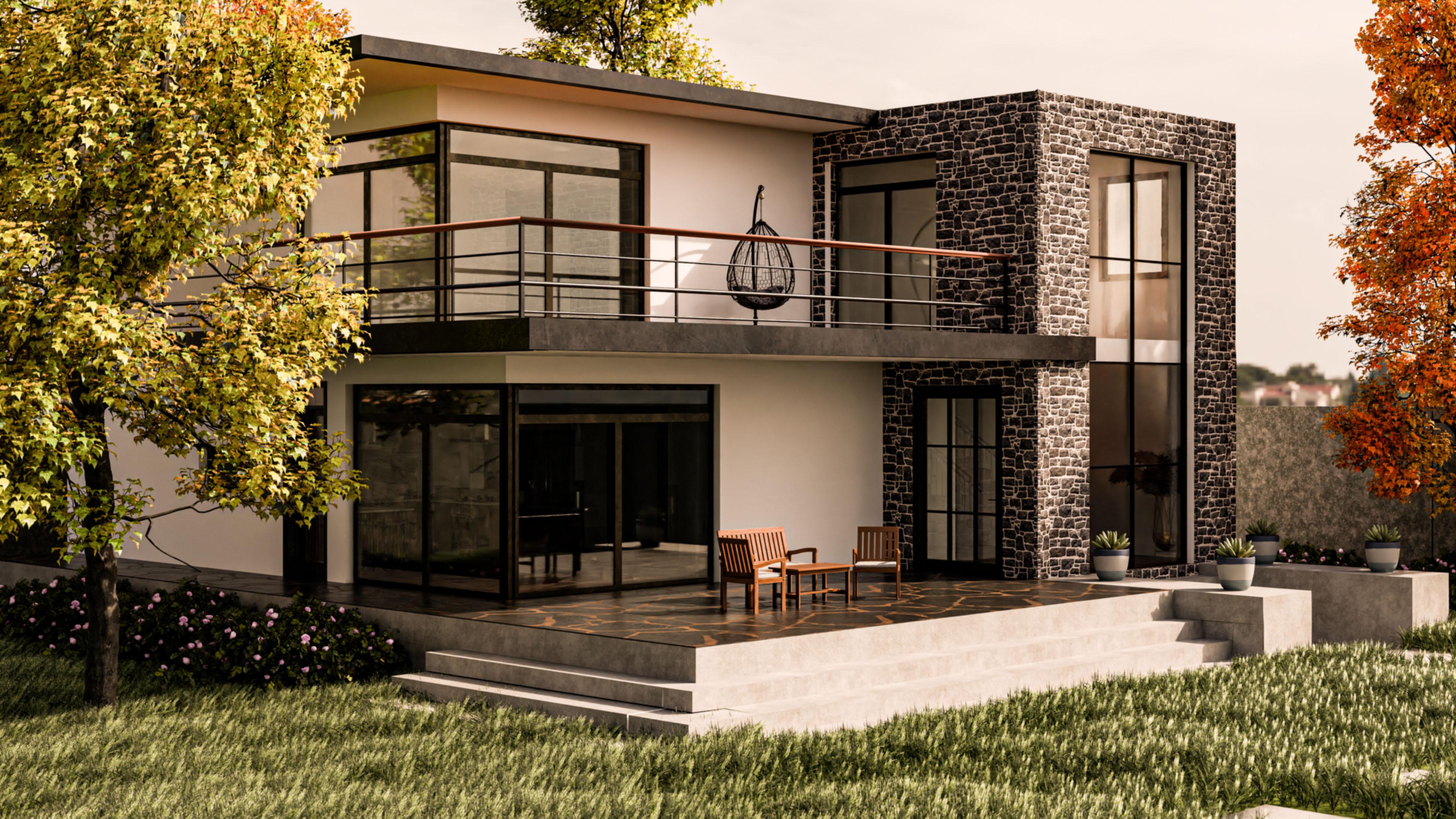 - The structure's exterior combines smooth plaster surfaces with textured stone cladding, providing a balanced mix of modern and rustic aesthetics.